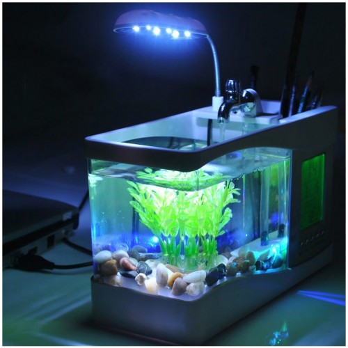 Настольный маленький USB аквариум не уступает большому полноценному аквариуму, комфортная жизнь рыбок обеспечивается специальным насосом для создания эффекта проточной воды и системой ее фильтрации. портативный мини аквариум оснащен светодиодной LED подсветкой, органайзером для канцелярских принадлежностей (отлично помещаются ручки, карандаши, ножницы и.т.д), лампой, часами с музыкой, будильником, календарем, таймером обратного отсчета и термометром который довольно точно измеряет и показывает температуру. Работает не только от USB порта, но и от розетки (также как ваш мобильный телефон)